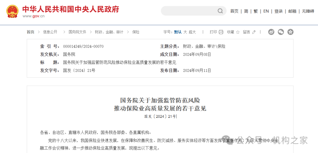 为深入贯彻中央金融工作会议精神,进一步推动保险业高质量发展,9月11日,国务院正式发布《关于加强监管防范风险推动保险业高质量发展的若干意见》(以下简称《若干意见》),旨在指导保险业的高质量发展,确保行业在保障和改善民生、防灾减损、服务实体经济等方面发挥更大作用。